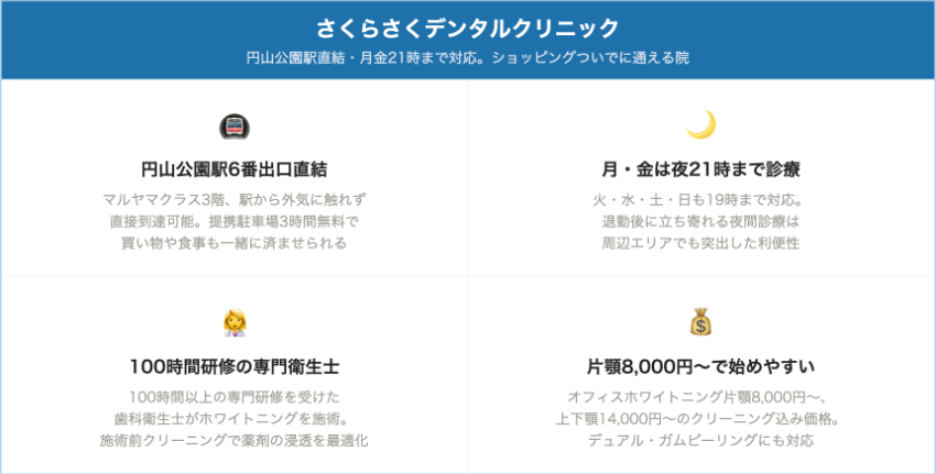 | さくらさくデンタルクリニック | 中央区・円山公園駅直結 | 8,000円〜(片顎12本) | 相談時に確認 | 相談時に確認 | 対応あり(要確認) | 日曜19:00まで | 月・金 21:00まで | 施設内3時間無料 | 現金・クレジット・電子マネー・デンタルローン(アプラス) |