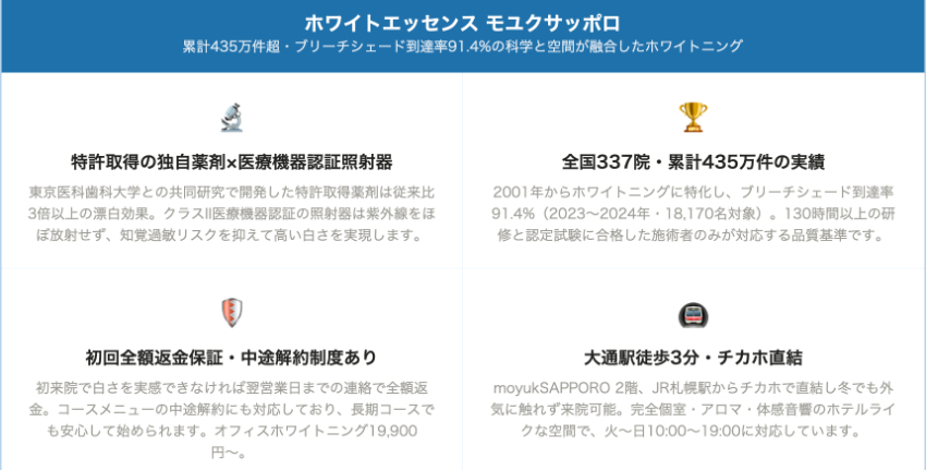 ホワイトエッセンスモユクサッポロ(さいわいデンタルクリニックmoyukSAPPORO内)|全国累計435万件超・ブリーチシェード到達率91.4%が証明する、科学と空間が融合したホワイトニング体験